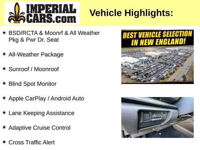 Boasting an impressive array of features, the Crosstrek Premium sets itself apart from the competition. Highlights include a power moonroof, blind spot detection with rear cross-traffic alert, a 10-way power driver's seat, heated exterior mirrors, heated front seats, and heated wipers. The All-Weather Package further enhances your driving experience with added protection against the elements.