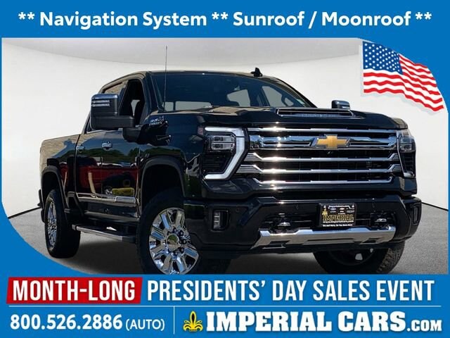 Navigation System, Sunroof / Moonroof, Blind Spot Monitor, Lane Keeping Assistance, Cross Traffic Alert, Apple CarPlay / Android Auto, Power Leather Seats, Heated Seats, Backup Camera, Bluetooth, Cruise Control, Power Windows, Power Locks, Steering Wheels Radio Controls, Aluminum Wheels, Running Boards / Side Steps, Towing Package, 10-Speed Automatic, 4WD, Jet Black w/Leather-Appointed Front Outboard Seat Trim, 120-Volt Bed Mounted Power Outlet, 120-Volt Interior Power Outlet, 170 Amp Alternator, 6 Rectangular Chromed Tubular Assist Steps, Auto-Dimming Inside Rear-View Mirror, Bed View Camera w/2 Trailer Camera Provisions, Black Chevytec Spray-On Bedliner, Bluetooth® For Phone, Chevrolet Connected Access Capable, Chrome Door Handles, Chrome Mirror Caps, Color-Keyed Carpeting Floor Covering, Compass, Deep-Tinted Glass, Electric Rear-Window Defogger, Electronic Cruise Control w/Set & Resume Speed, Front Carpeted Floor Mats, Front Chrome Recovery Hooks, Front LED Fog Lamps, Front Rain-Sensing Wipers, Heated 2nd Row Outboard Seats, Heated Steering Wheel, Hitch Guidance w/Hitch View, In-Vehicle Trailering App System, Keyless Open & Start, LED Cargo Area Lighting, Manual Tilt & Telescoping Steering Column, OnStar & Chevrolet Connected Services Capable, Polished Exhaust Tip, Power Door Locks, Power Front Windows w/Driver Express Up/Down, Power Front Windows w/Passenger Express Up/Down, Power Rear Windows w/Express Down, Power Sliding Rear Window w/Defogger, Preferred Equipment Group 3LZ, Push Button Start, Pwr Up/Down Tailgate Function w/Pwr Lock & Release, Rear Carpeted Floor Mats, Rear Cross Traffic Alert, Rear Wheelhouse Liners, Remote Vehicle Starter System, SiriusXM w/360L, Standard Tailgate, Steering Wheel Audio Controls, Suspension Package, Trailer Camera Provisions, Ultrasonic Front & Rear Park Assist, Unauthorized Entry Theft-Deterrent System, Universal Home Remote, Up-Level Rear Seat w/Storage Package, Wi-Fi Hotspot Capable, Wireless Charging, Wireless Phone Projection, Wrapped Steering Wheel. Black 2024 Chevrolet Silverado 2500HD High Country 4D Crew Cab High Country 4WD 10-Speed Automatic