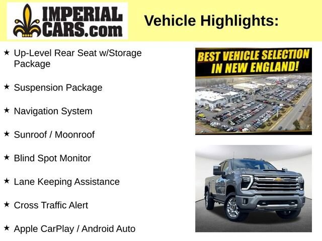 Navigation System, Sunroof / Moonroof, Blind Spot Monitor, Lane Keeping Assistance, Cross Traffic Alert, Apple CarPlay / Android Auto, Power Leather Seats, Heated Seats, Backup Camera, Bluetooth, Cruise Control, Power Windows, Power Locks, Steering Wheels Radio Controls, Aluminum Wheels, Towing Package, 10-Speed Automatic, 4WD, Brown Leather, Suspension Package, Up-Level Rear Seat w/Storage Package. Silver Ice Metallic 2024 Chevrolet Silverado 3500HD High Country 4D Crew Cab High Country 4WD 10-Speed AutomaticPriced below KBB Fair Purchase Price! Clean CARFAX. Duramax 6.6L V8 Turbodiesel Odometer is 22347 miles below market average!MORE ABOUT US: Imperial Cars Purchase With Confidence: 1) Free Car Fax Vehicle History Report available for all our vehicles online. 2) Our vehicles are Imperial Certified and go through a rigorous Multi-Point vehicle inspection. 3) Bottom line pricing. 4) 5-Day or 200 Mile Vehicle Exchange Program for your total confidence. If you are not happy with it bring it back within 7 days or 200 miles and we'll give you a credit of your full purchase price toward the purchase of another vehicle. (Excludes Renewed for You vehicles.)Please be aware that the price listed for the vehicle does not include tax, title, registration, documentation fee, or any other applicable fees. However, it does include a trade-in assistance bonus of $1,000 for qualifying retailable trades with less than 10 years of use from the original in-service date. To be eligible for the advertised promotional price, you must pay in full and take delivery of the vehicle from dealer stock on the same day. For the most up-to-date information and Imperial discounts, please call or email our phone and internet team. Please note that the price cannot be combined with any other discounts or promotions and is subject to change based on the market value at any time without notice. To receive the internet special discount, please mention the promo code INTERNET1. While we strive to provide reliable information, please note that the dealer is not responsible for any misprints involving the price and/or description of any vehicle offered for sale. It is your sole responsibility to inspect and verify such information before making a purchase. We want to be transparent in our dealings, and to that end, you can call 800-526-AUTO (2886) to receive your personalized Buy-For-Price. Lastly, please note that we do not sell to wholesalers or dealers, and some of our pre-owned vehicles may be subject to unrepaired safety recalls. To check if any vehicle has unrepaired recalls, you can look up the vehicle's VIN at https://www.nhtsa.gov/recalls.