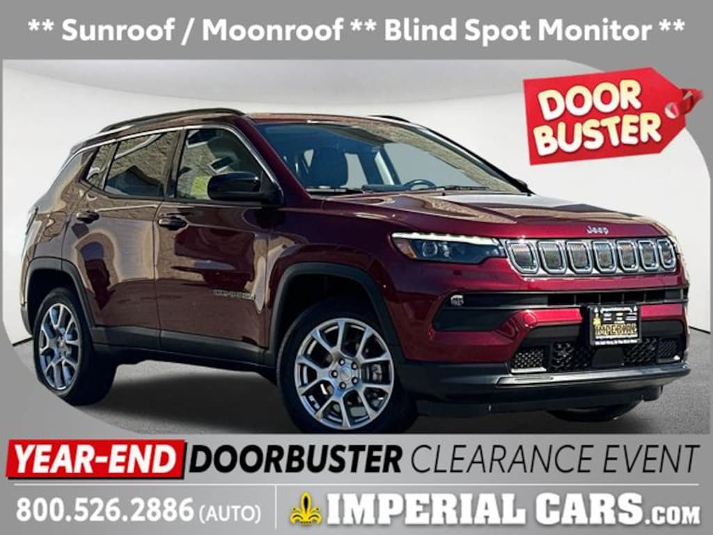 New Price! Recent Arrival! Sunroof / Moonroof, Blind Spot Monitor, Lane Keeping Assistance, Apple CarPlay / Android Auto, Power Leather Seats, Cross Traffic Alert, Backup Camera, Bluetooth, Cruise Control, Power Windows, Power Locks, Steering Wheels Radio Controls, Aluminum Wheels, Luggage Rack, 4WD, LED Low/Highbeam Projector Headlamps, MOPAR All-Weather Floor Mats, MOPAR Interior Protection Package, MOPAR Molded Cargo Tray, Power Front/Fixed Rear Full Sunroof, Premium Alpine Speaker System, Premium LED Fog Lamps, Premium Lighting Group, Premium Taillamps, Quick Order Package 2GL, Sun and Sound Group. Velvet Red Pearlcoat 2022 Jeep Compass Latitude Lux 4D Sport Utility Latitude Lux 4WD 9-Speed 948TE Automatic