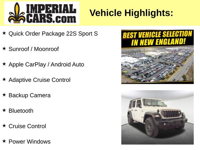 Equipped with a powerful 2.0L I4 DOHC engine and 8-speed automatic transmission, the Wrangler Sport S delivers impressive performance and 4-wheel drive capability. Standout features include - Adaptive Cruise Control, Apple CarPlay/Android Auto, Backup Camera, Bluetooth, Cruise Control, Power Locks, Power Windows, Steering Wheel Radio Controls, and a Sunroof/Moonroof. The Quick Order Package 22S Sport S further enhances the Wrangler's capabilities with premium touches like a Security Alarm, Enhanced Adaptive Cruise Control, a Premium Wrapped Steering Wheel, Automatic Headlamps, Corning Gorilla Glass, Power Heated Mirrors, Full Speed Forward Collision Warning Plus, and more.