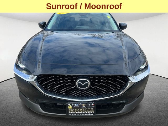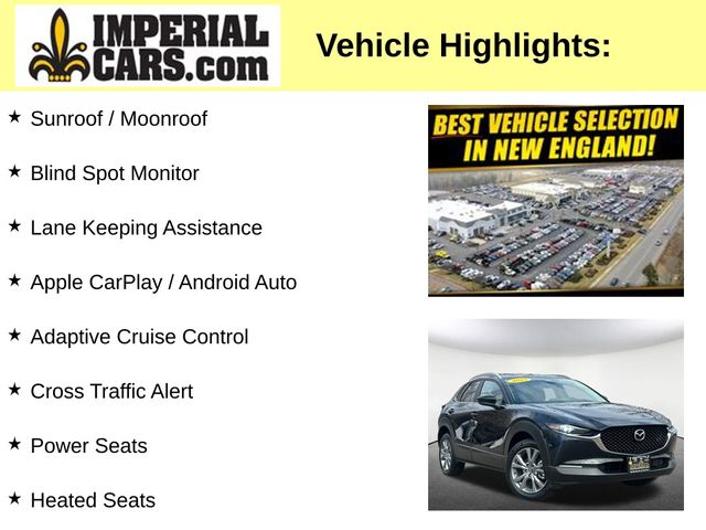Exterior highlights include the sleek and modern design, complemented by 18-inch aluminum alloy wheels and a power moonroof, creating a striking presence on the road. The CX-30's versatile cargo space and available roof rails make it an ideal companion for your active lifestyle, whether you're embarking on a weekend getaway or tackling your daily commute.